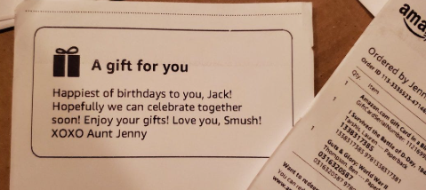 - Packaging: If gift-wrapped, the message card is in a special envelope marked "Don't spoil the surprise". If not wrapped, it's usually just on the packing slip.